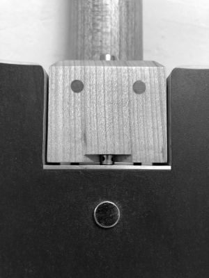 My neck joint establishes a three-point contact between the neck and the body of the guitar, with all three points being adjustable. This allows for incredible adjustment and a solid fixed-height bridge, as the string height is determined by the neck angle.